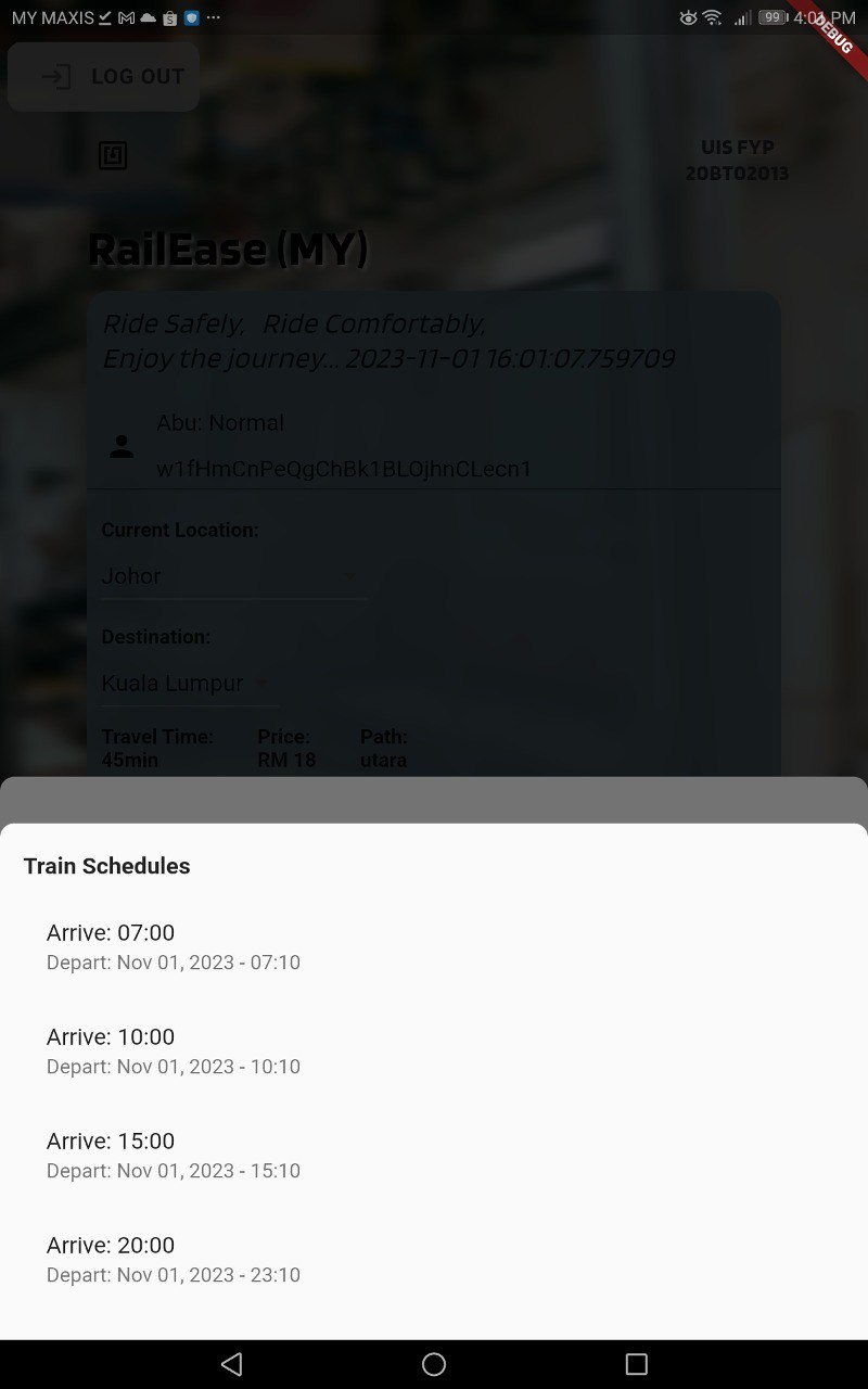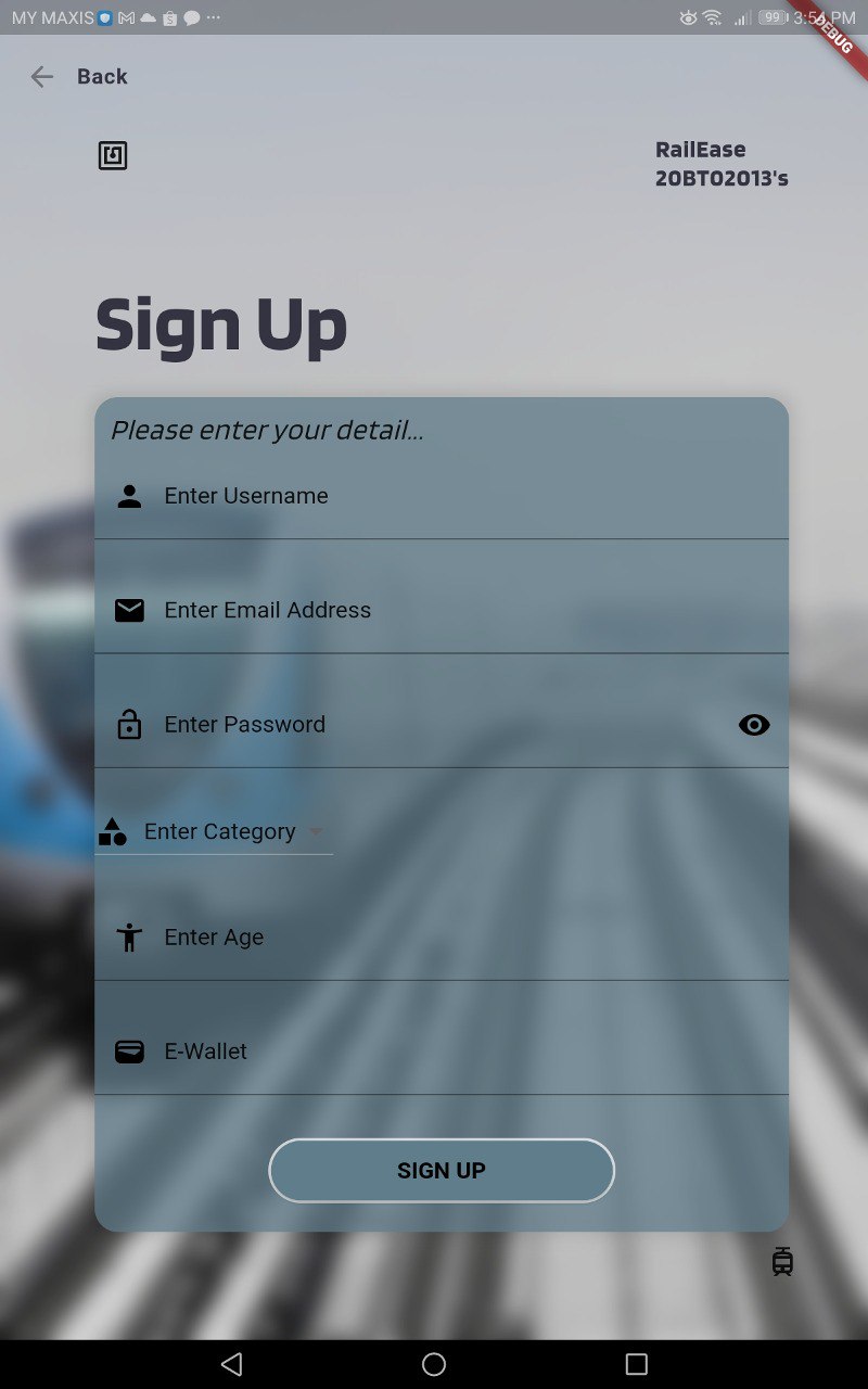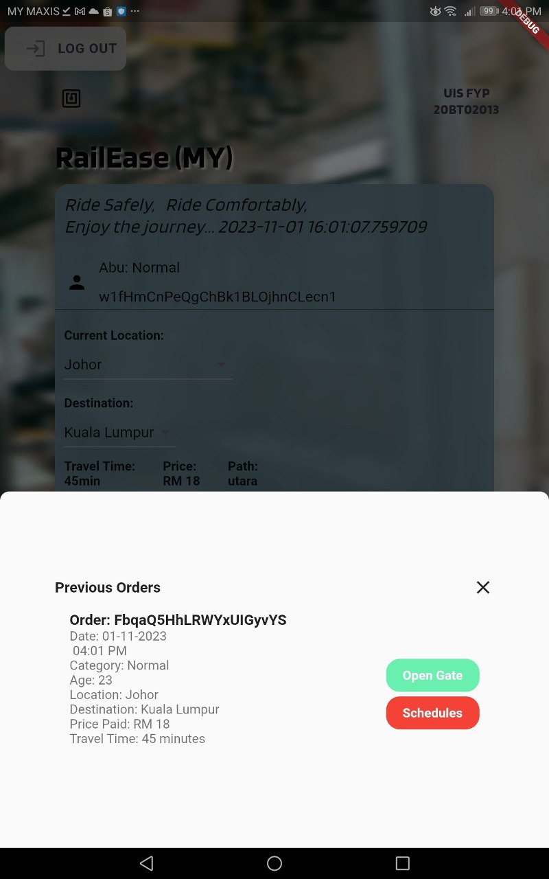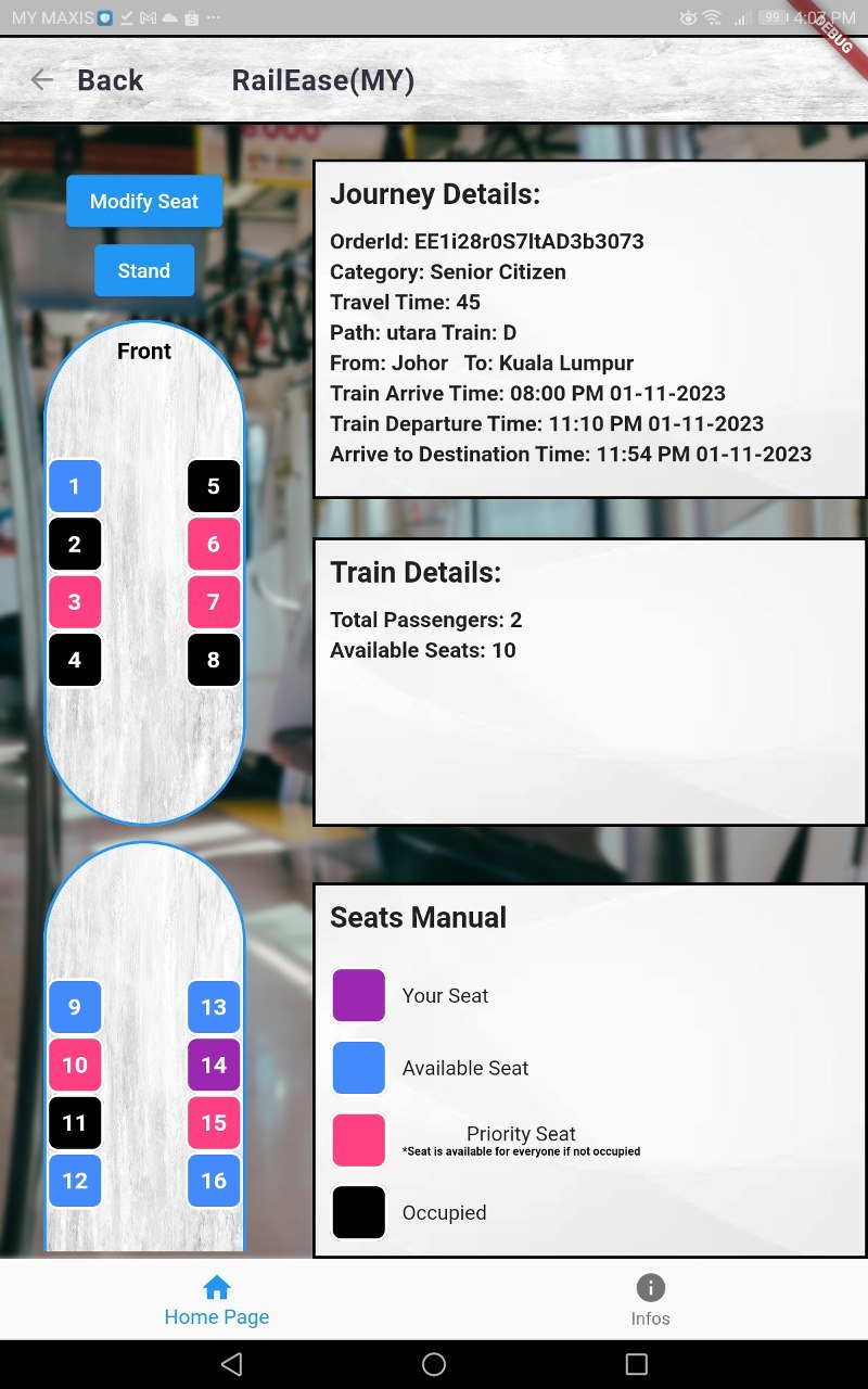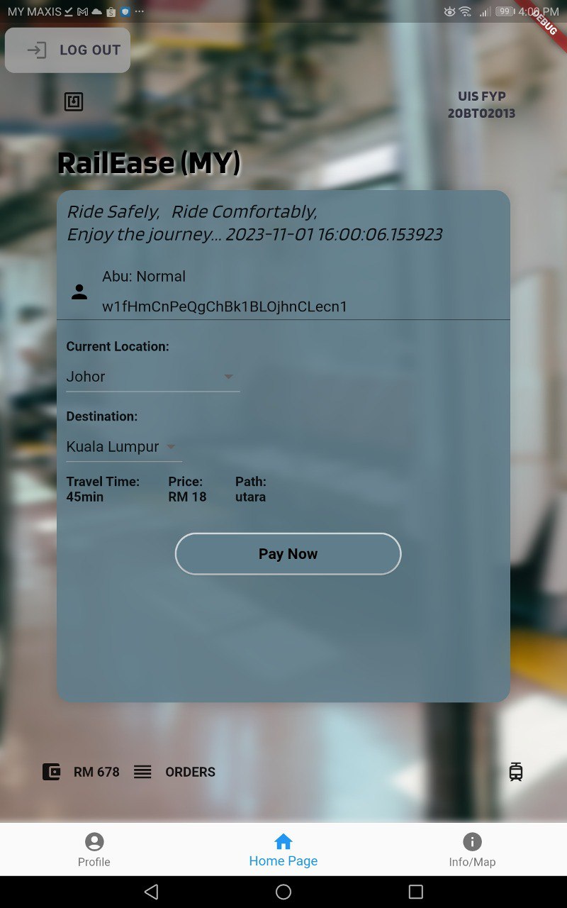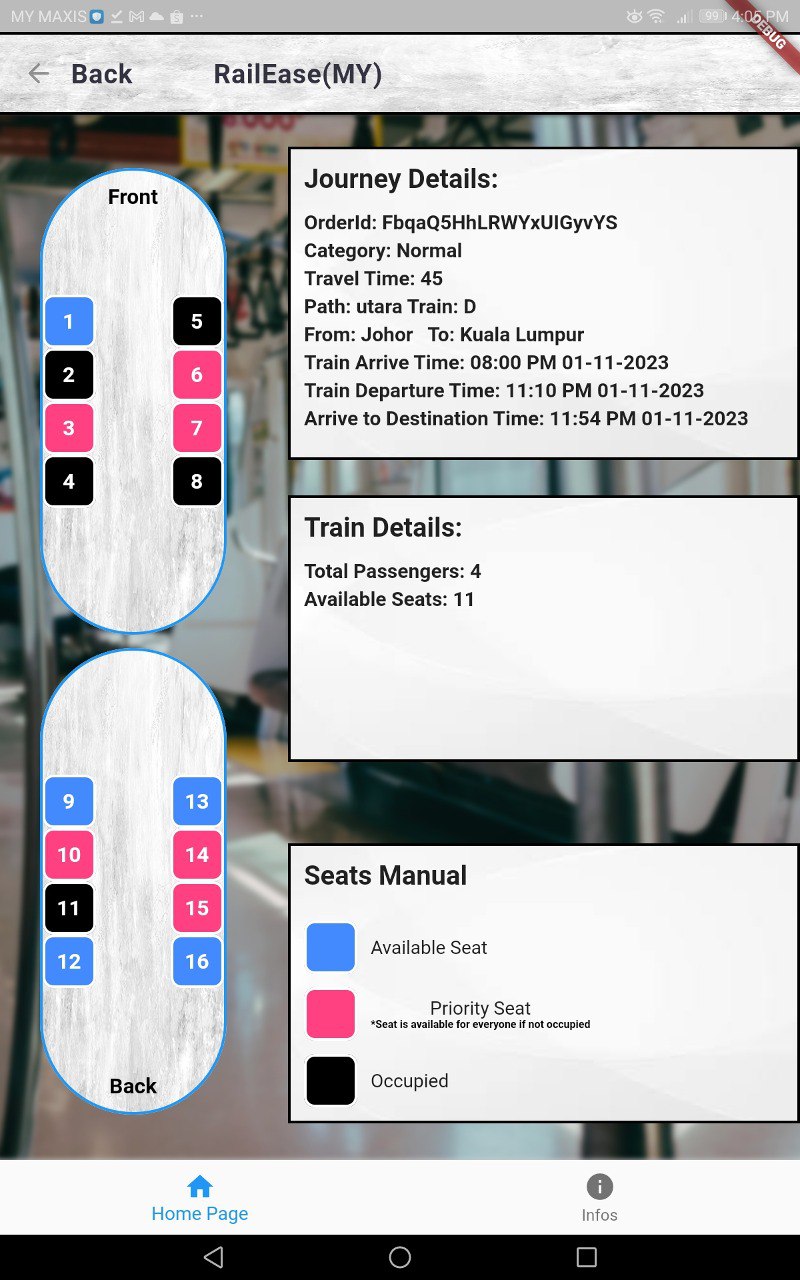 In highly populated and urban area, public transport, especially rail transport like the LRT, MRT, Monorail, and others, are important and in higher demand among consumers. Nevertheless, passengers have not yet been exposed to applications with compact features and Malaysian public transportation services and facilities are still lacking in quality. Introducing 'RailEase’, our all-in-one rail transportation app. With it, you can book ticket, check schedules, get priority seats and get real-time train information right at your fingertips. Technology is advancing, and the word IoT is gaining popularity these days. IoT stood for Internet of Things and was first proposed by Kevin Ashton in 1999. With the help of this technology structure, it can help us achieve our objective of improving our rail transport service infrastructure in Malaysia. We need to review the existing public railway system apps with the aim of identifying areas for improvement in order to enhance overall customer satisfaction and experience, design and develop a Public Rail Transport Infos and Priority Seat Booking System (RailEase) that offer comprehensive all-in-one features to users, and verify or test the functionality of the developed system to ensure its operation runs as expected. After much time of consideration, the project has been decided to be developed with the prototyping model as it offers fast development. Various technologies, platforms and tools have been considered to be integrated in building this project, offering smooth features functioning for better user experience. User can book ticket, check schedules, get priority seats and get real-time train information efficiently. Therefore, the RailEase objective is archived as it surpassed the lack of convenient system provides on the public rail transport in Malaysia.